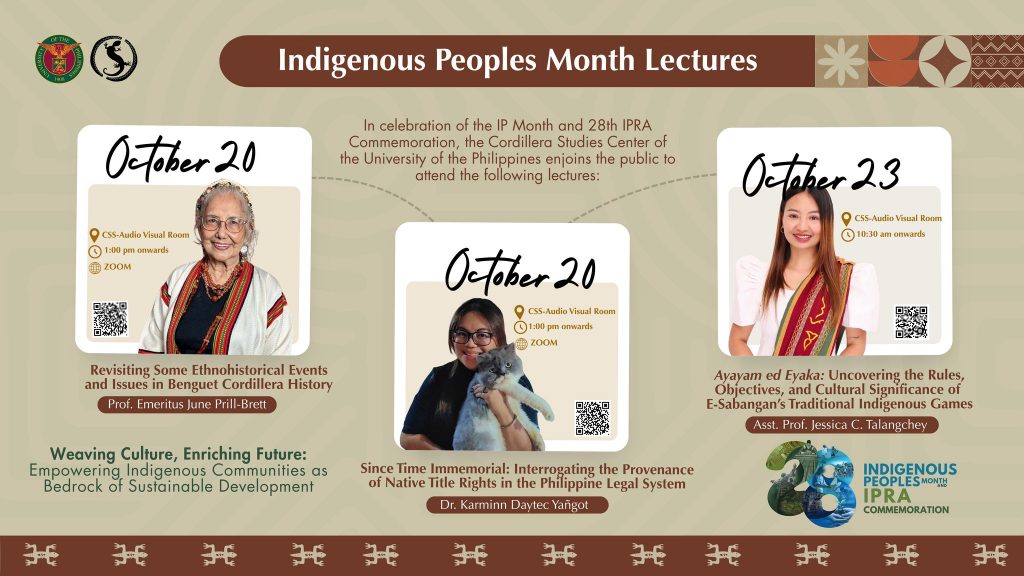 In celebration of the Indigenous Peoples Month and 28th IPRA Commemoration, the Cordillera Studies Center of the University of the Philippines enjoins the public to attend the following lectures: