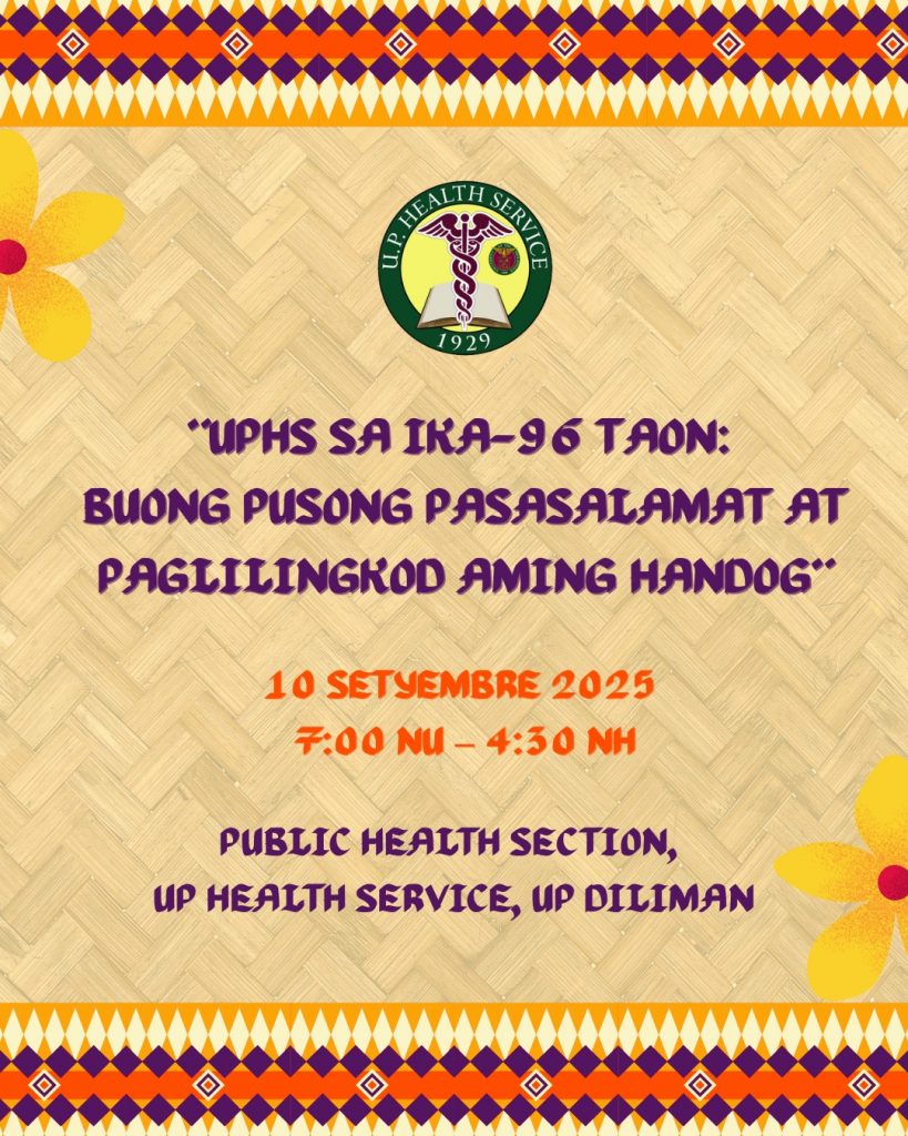 Bilang bahagi ng aming Ika-96 Anibersaryo, inaanyayahan namin ang buong komunidad ng UP Diliman na makiisa sa isang buong araw ng serbisyong pangkalusugan, edukasyon, at kasayahan! π©ΊπΊ