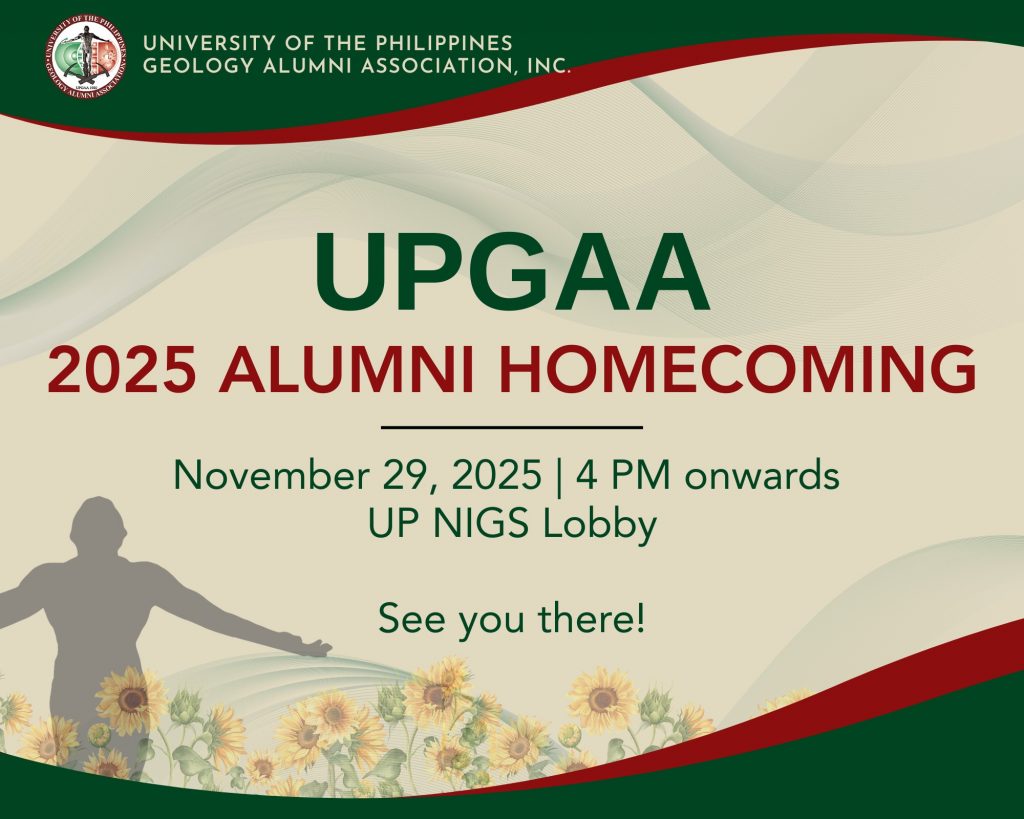 Calling all UP Geology alumni, especially the Jubilarian batches 1965, 1975, 1985, and 2000 – please save the date! See you on November 29 at UP-NIGS for a reunion of old friends, colleagues, and kindred spirits in celebration of contributions of our alumni in Philippine Geology.