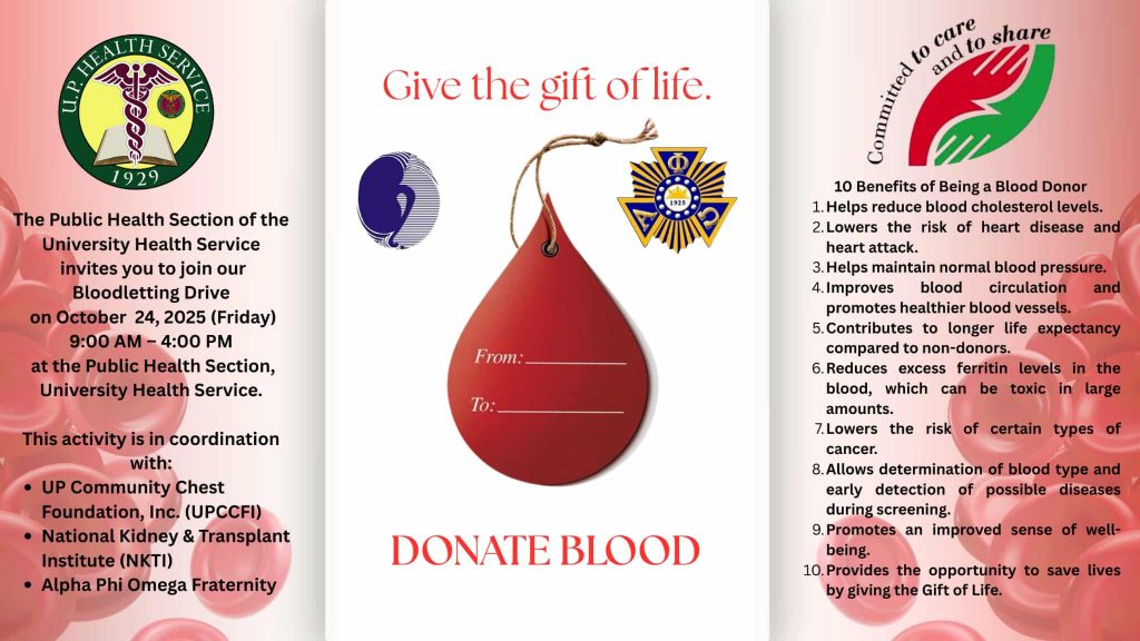 Inaanyayahan ang lahat na makiisa sa Bloodletting Drive ng Public Health Section, UP Health Service, na gaganapin sa 24 Oktubre 2025 (Biyernes), 9:00 AM – 4:00 PM. 💉 Source: UP Diliman Health Service Facebook