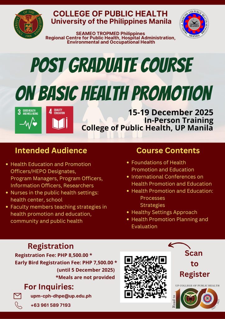 The Department of Health Promotion and Education of UP Manila College of Public Health invites you to the Post Graduate Course on Basic Health Promotion on December 15-19, 2025. This five-day face-to-face course will cover the essential concepts and strategies in health promotion and education.