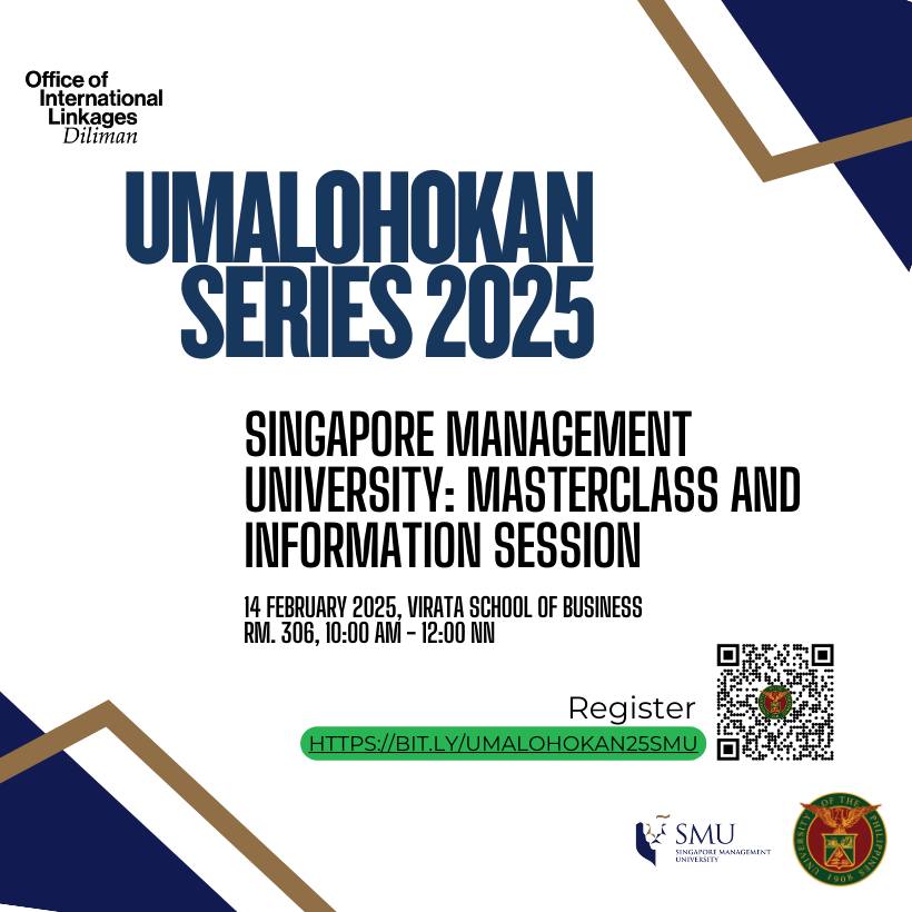 The Office of International Linkages Diliman (OILD) invites faculty, researchers, staff, and students to an information session: UP OIL Diliman Umalohokan Series: Singapore Management University’s (SMU) Masterclass and Info-Session on Various Master’s Degrees and Scholarship Schemes. This event will be held on 14 February 2025 (Friday) from 10:00 AM to 12:00 NN (PH Time) in the Virata School of Business, 3rd Floor Room 306.